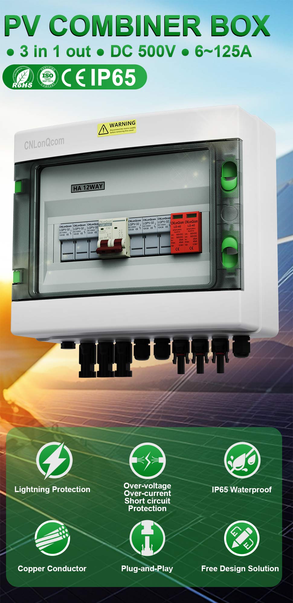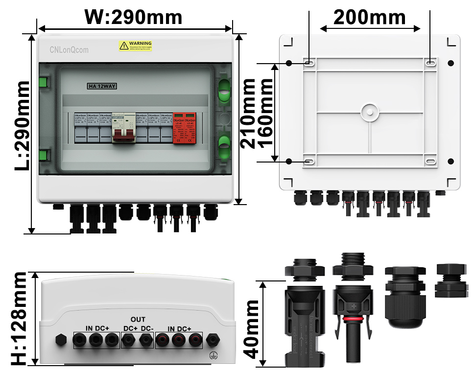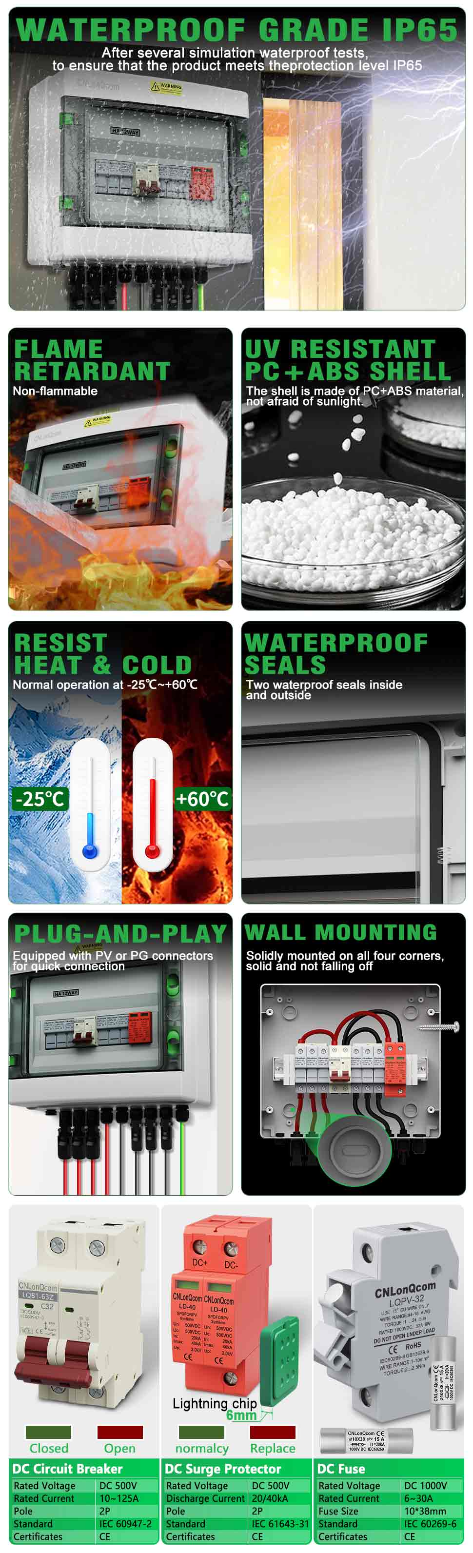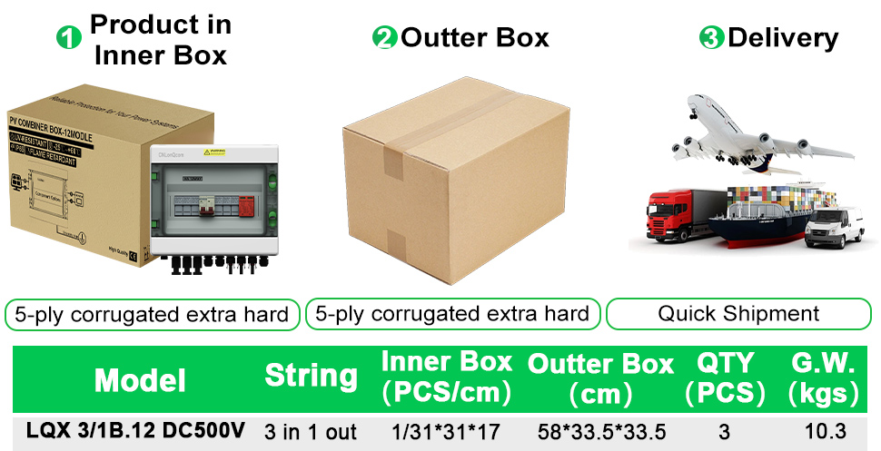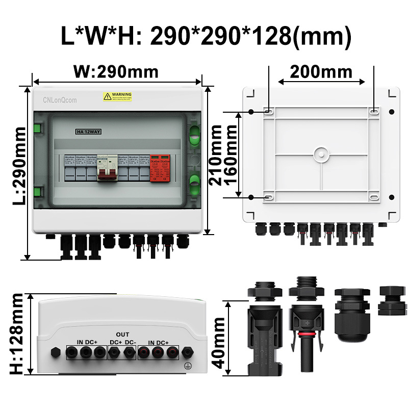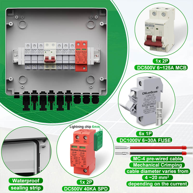 CNlonqCom компаниясының га пластикалық PV комбинері 3-тен кейін DC500V / 600V / 800V, негізінен PV жүйелерін қорғау үшін қолданылады және көбінесе тор немесе желілік жүйелерде қолданылады. Мысалы, PV панельдері, RV, қайық, ашық пв, үй шаруашылығы және т.б.