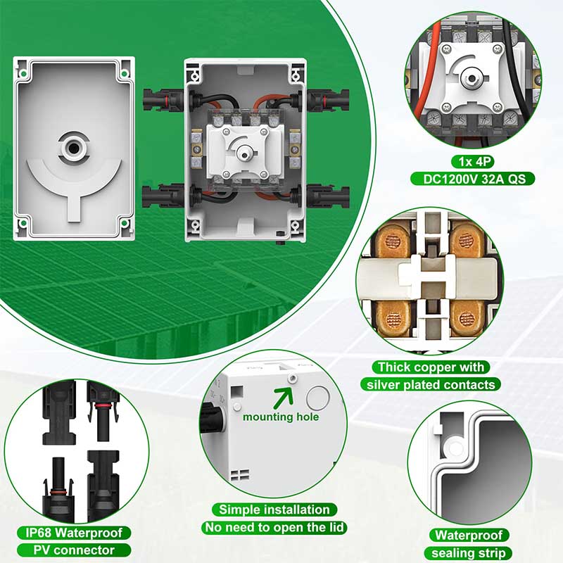 ● Moreover, our PV Solar Disconnect Switch DC1200V 32A 2in 2out come with an IP66 waterproof case, providing exceptional protection levels, made from high-quality plastic materials, UV resistant, and offering options for 2-4 poles suitable for distribution boxes. Compact in design and suitable for outdoor use, they protect your isolator switches from rain, dust, and other weather elements.